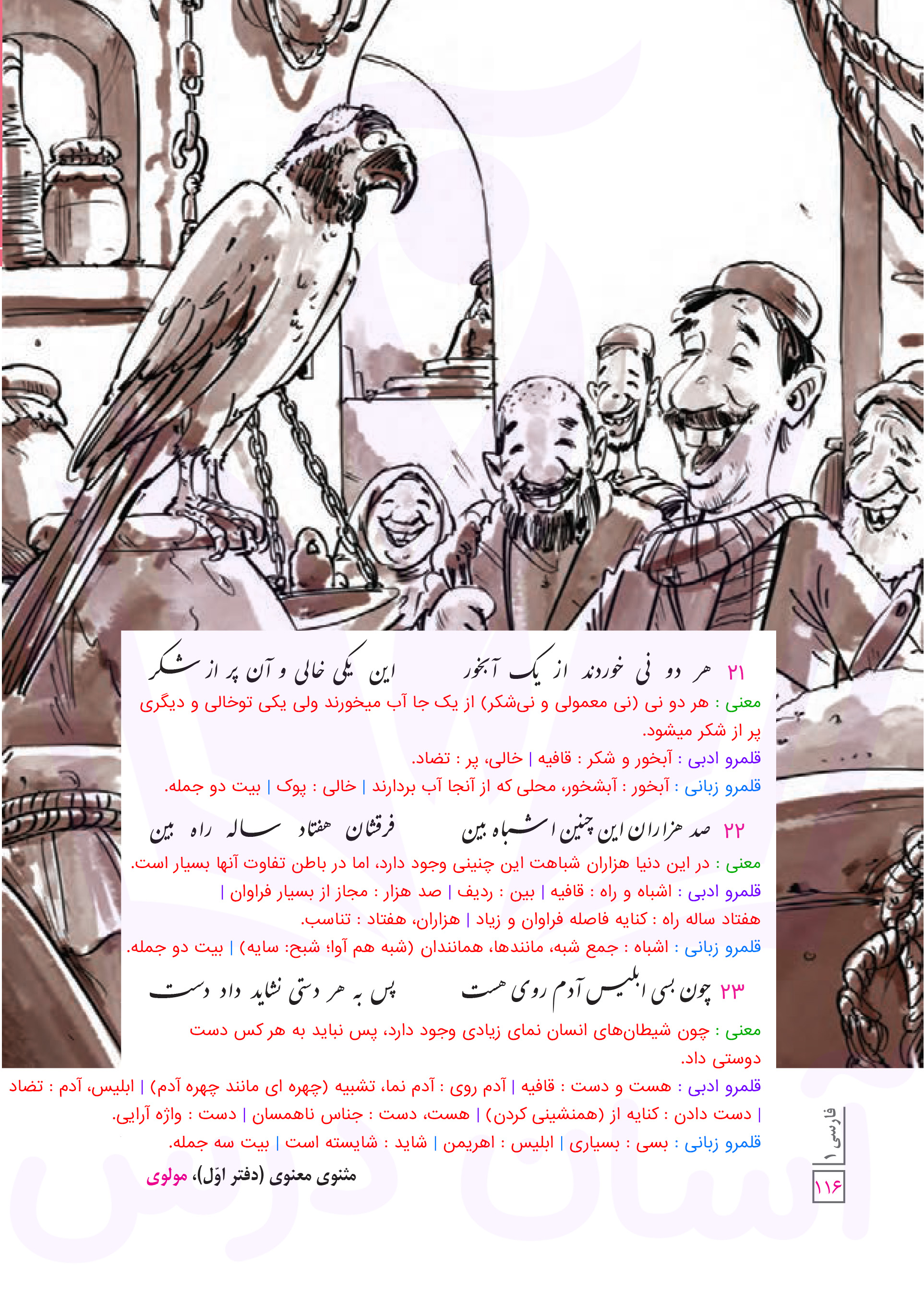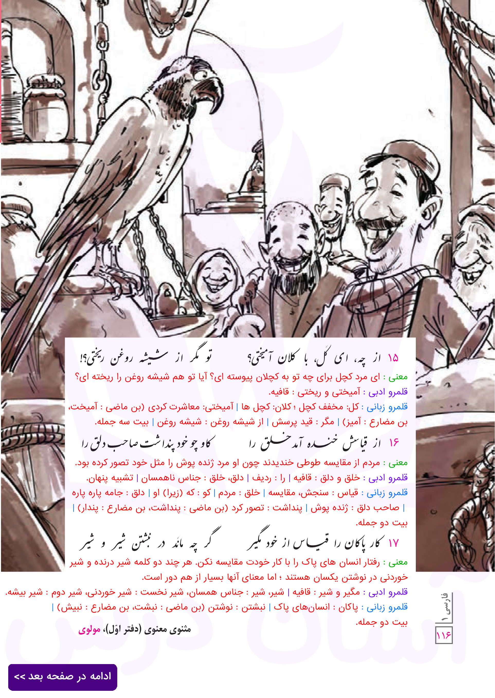 فارسی دهم : ادامه معنی درس چهاردهم (طوطی و بقّال) صفحه ۱۱۶