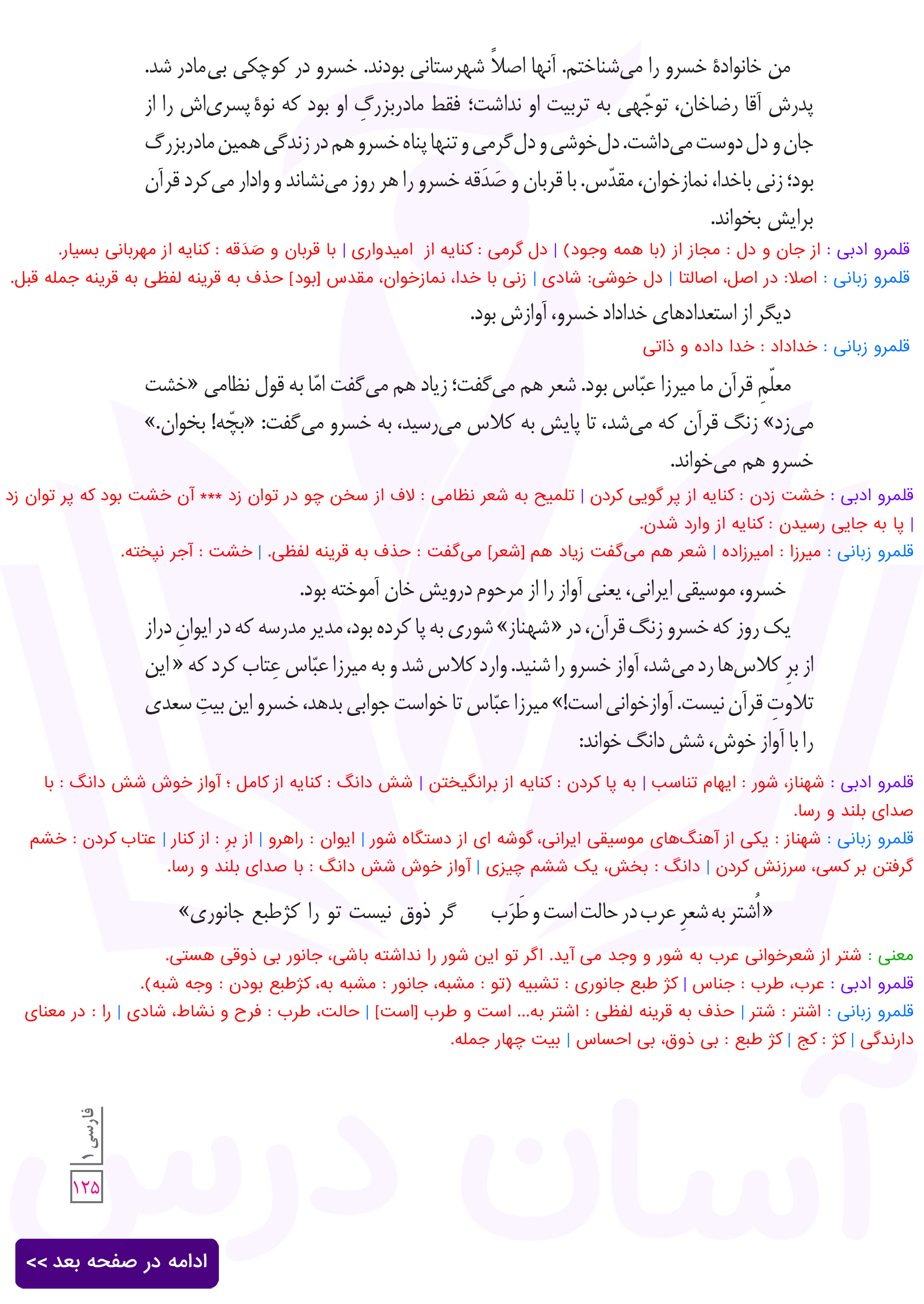 فارسی دهم : ادامه آرایه های درس شانزدهم (خسرو) صفحه ۱۲۵