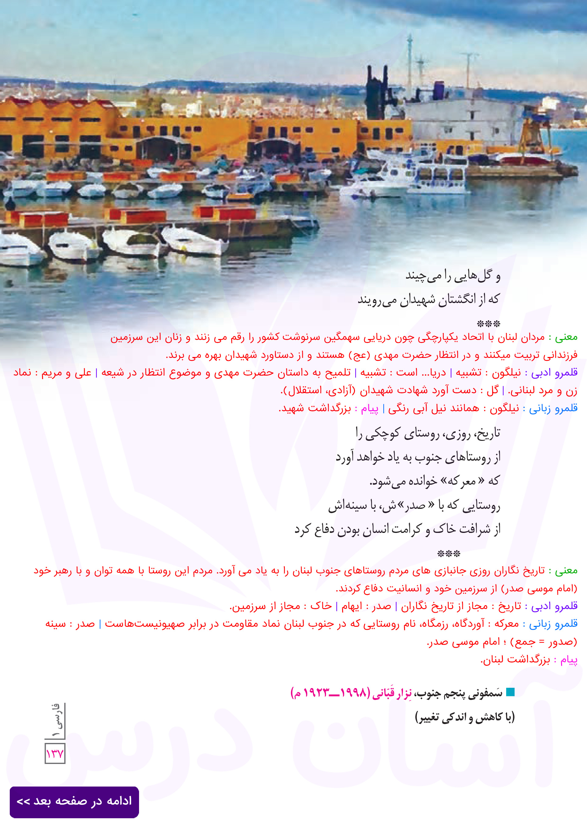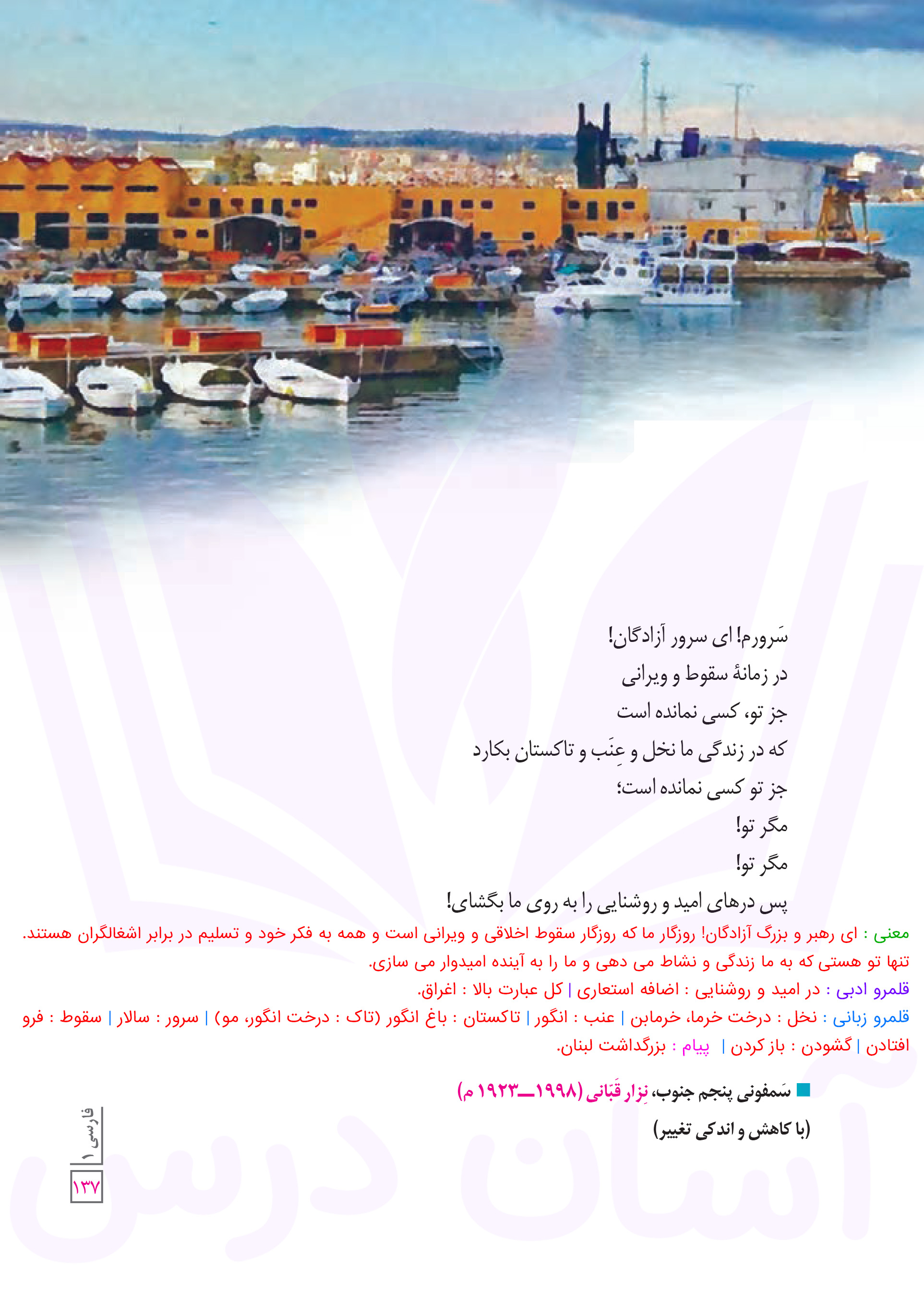 فارسی دهم : ادامه معنی درس هفدهم (سپیده دم) صفحه ۱۳۷