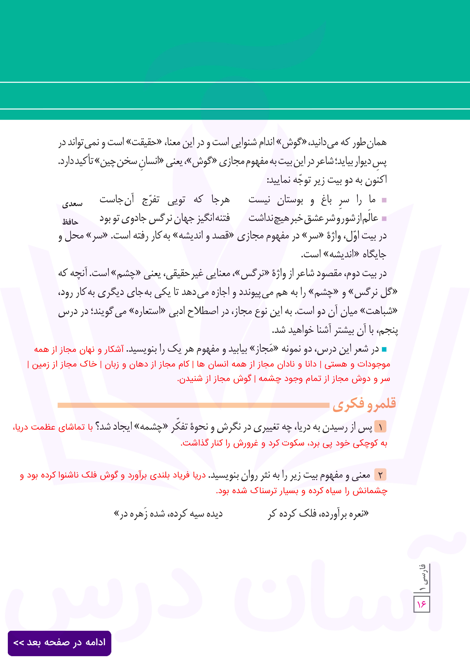 فارسی دهم : ادامه پاسخ قلمرو فکری صفحه ۱۶