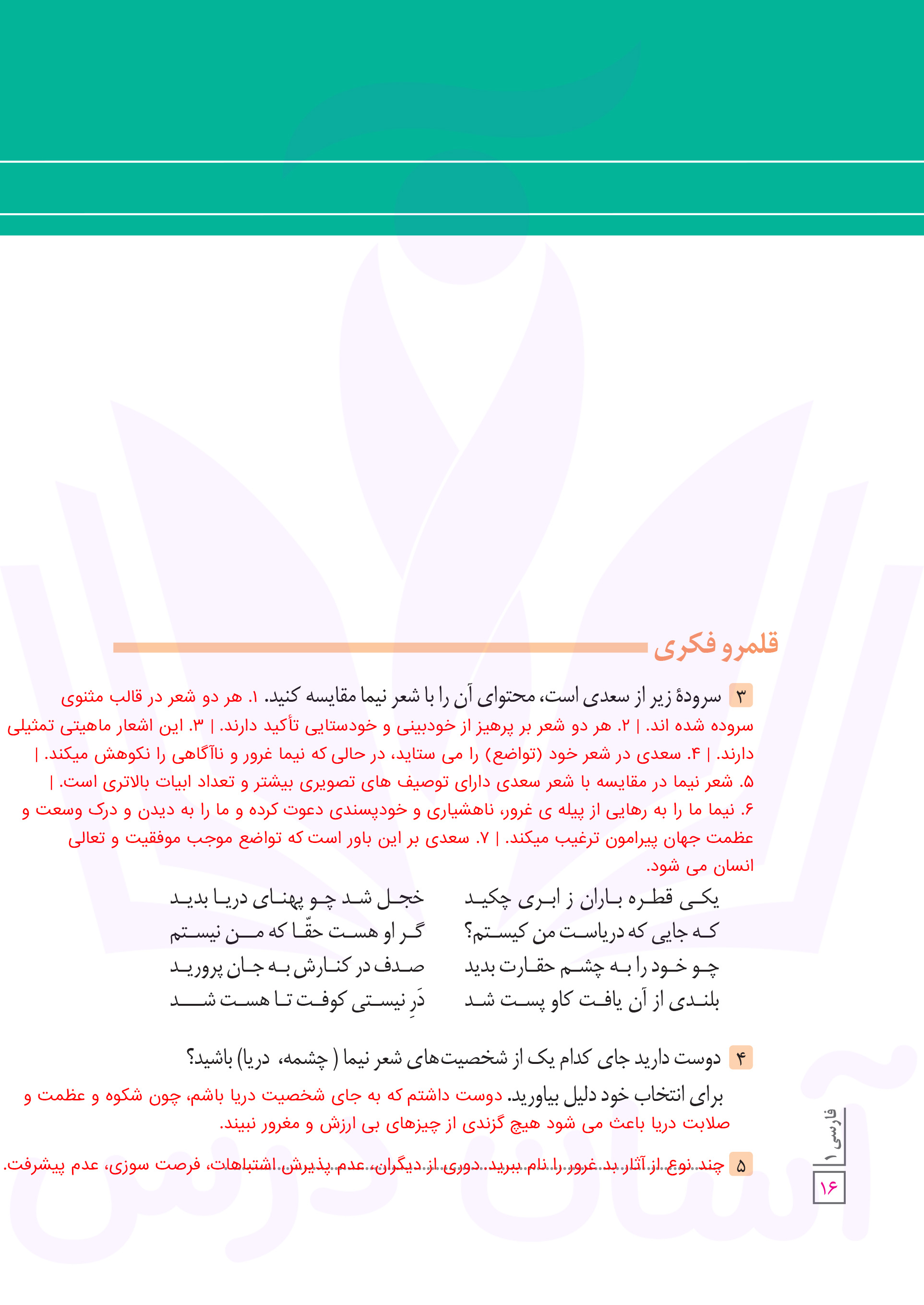 فارسی دهم : پاسخ قلمرو فکری صفحه ۱۶