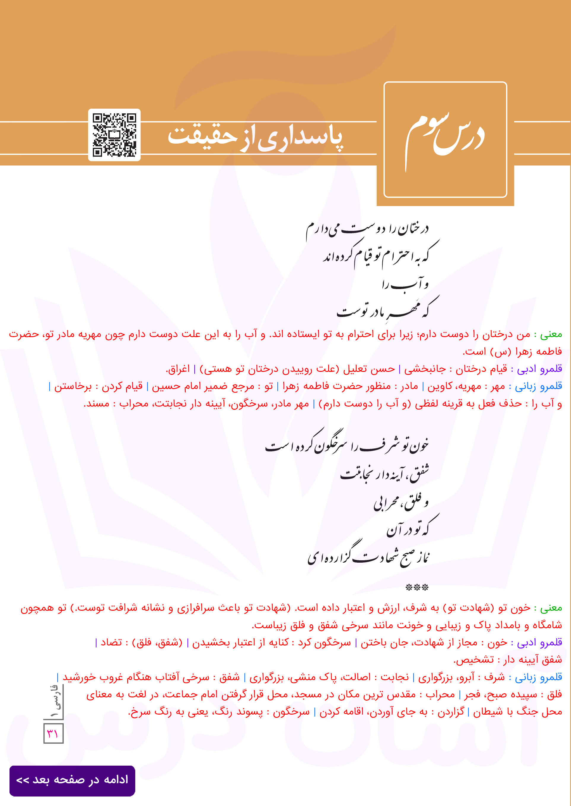 فارسی دهم : ادامه معنی درس سوم (پاسداری از حقیقت) صفحه ۳۱