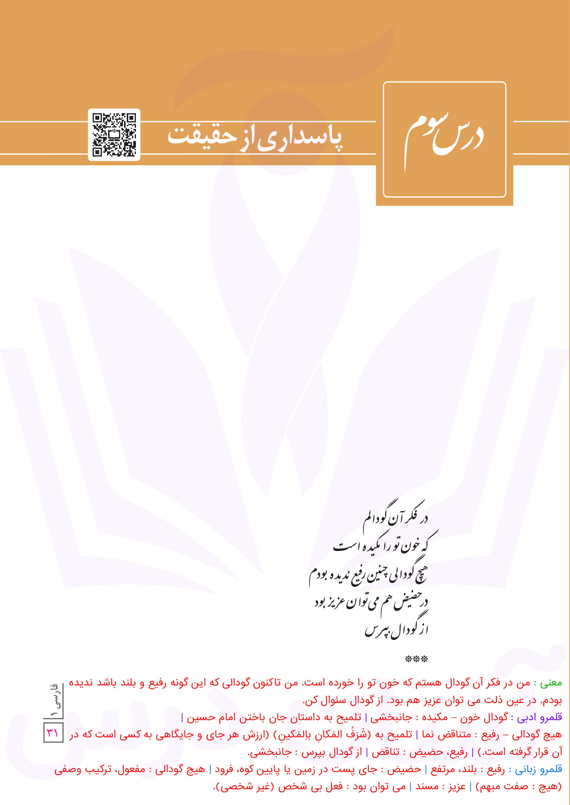 فارسی دهم : معنی درس سوم (پاسداری از حقیقت) صفحه ۳۱