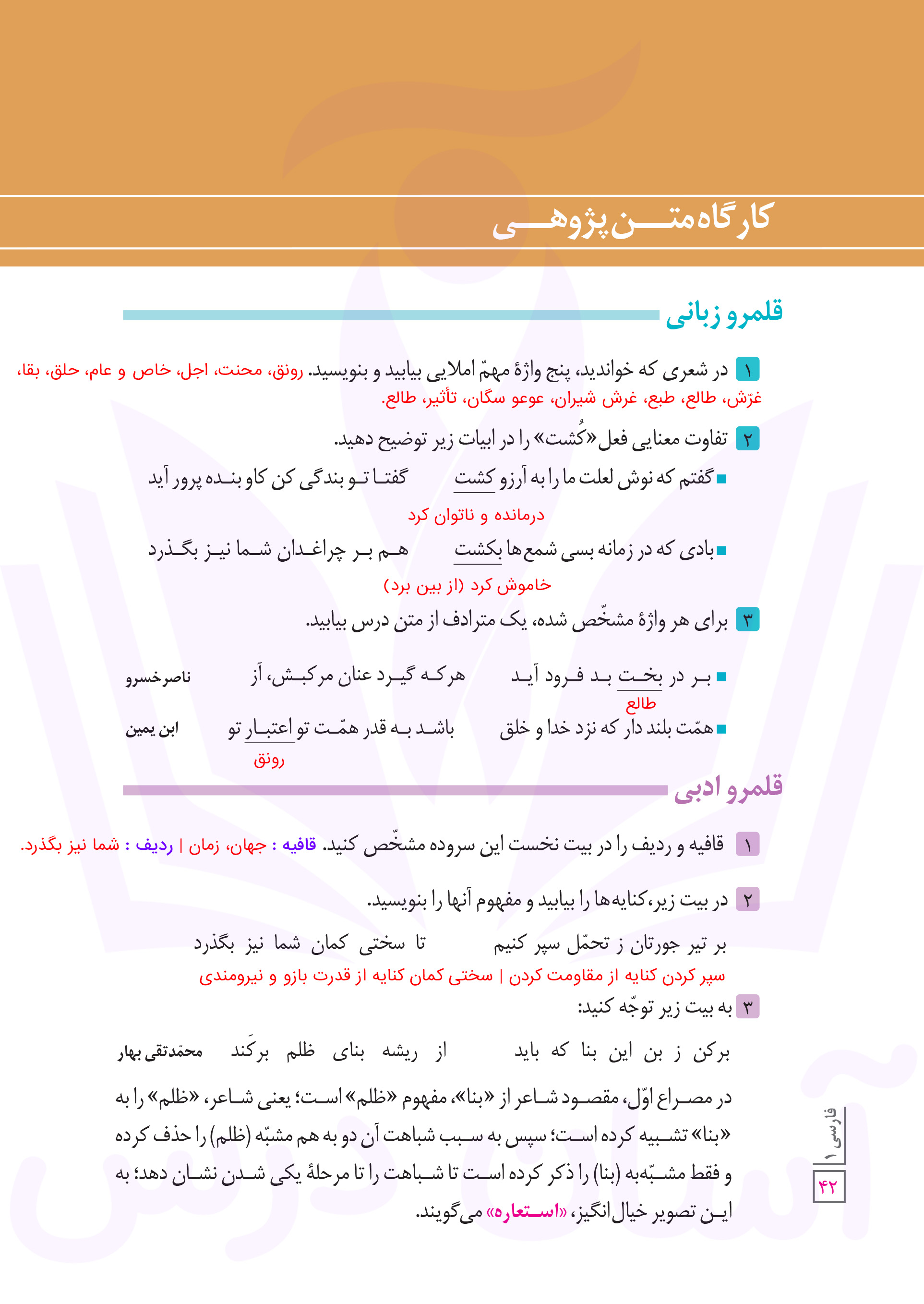 فارسی دهم : پاسخ قلمرو زبانی و قلمرو ادبی صفحه ۴۲