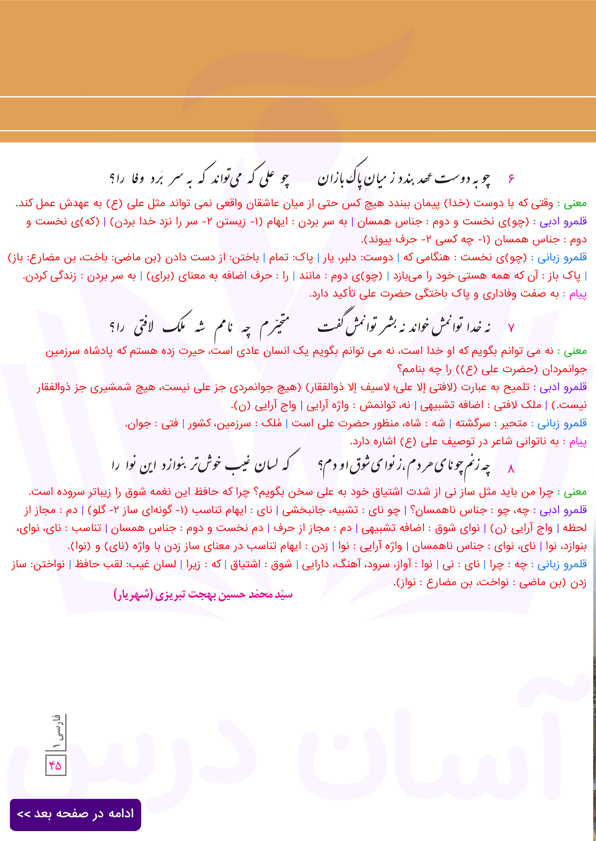 فارسی دهم : ادامه معنی شعرخوانی و پاسخ درک و دریافت صفحه ۴۵