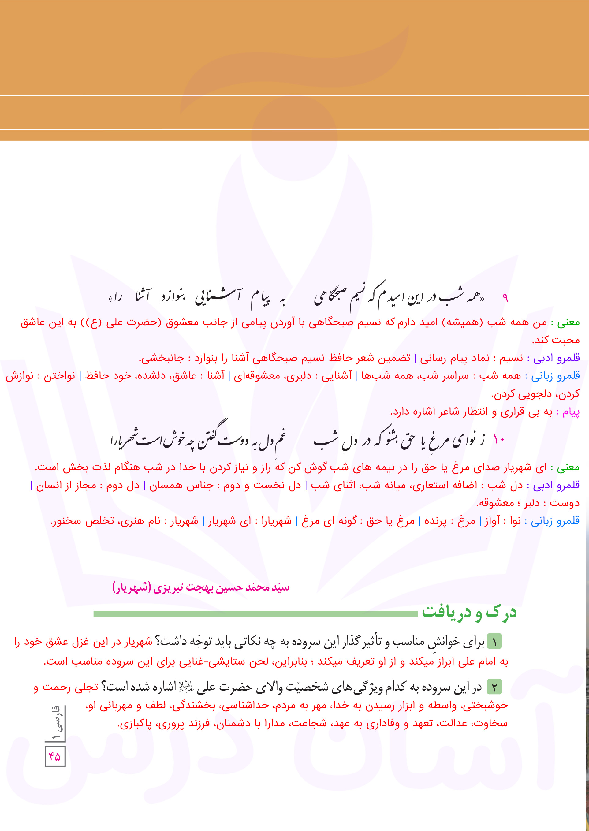 فارسی دهم : معنی شعرخوانی و پاسخ درک و دریافت صفحه ۴۵
