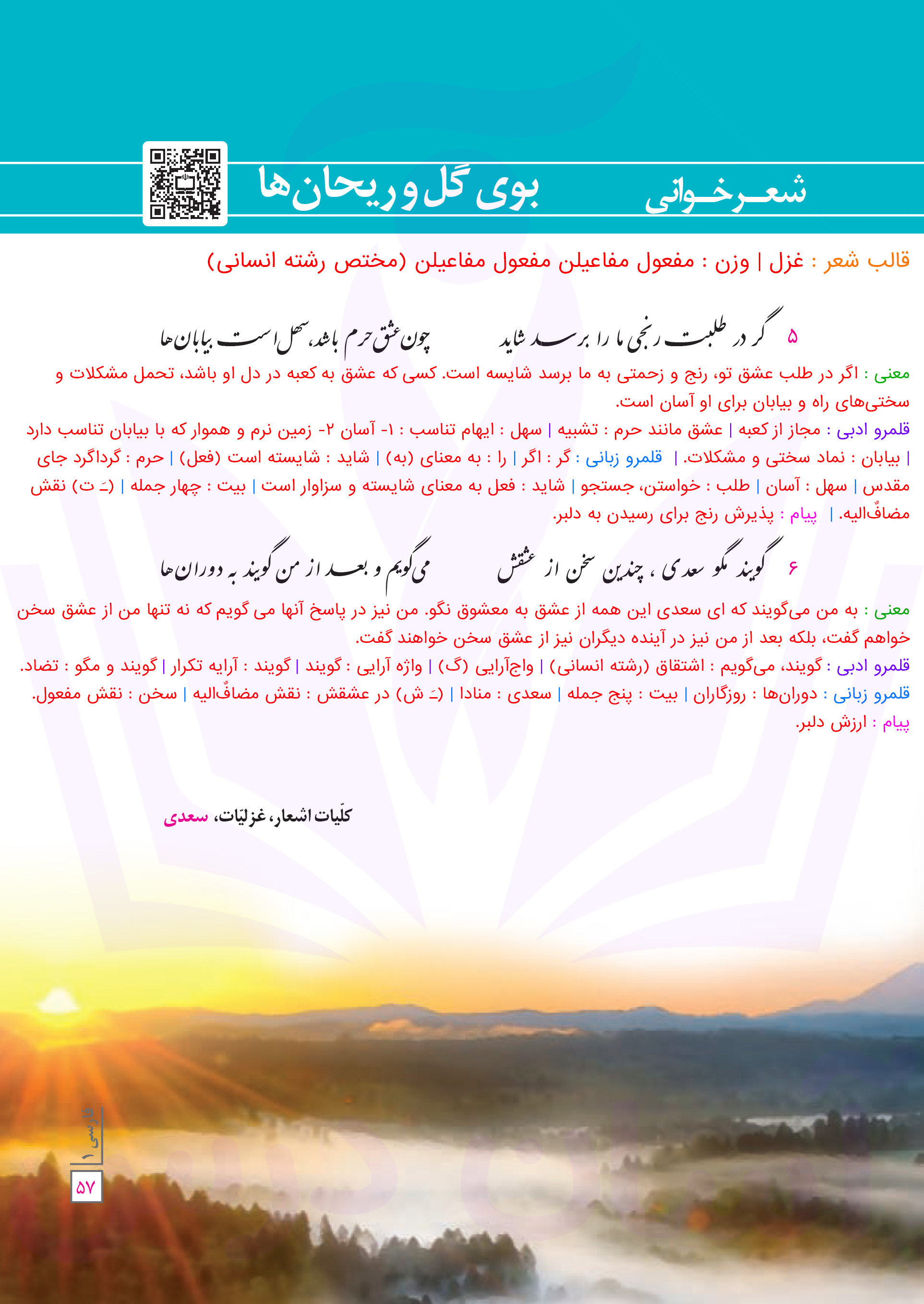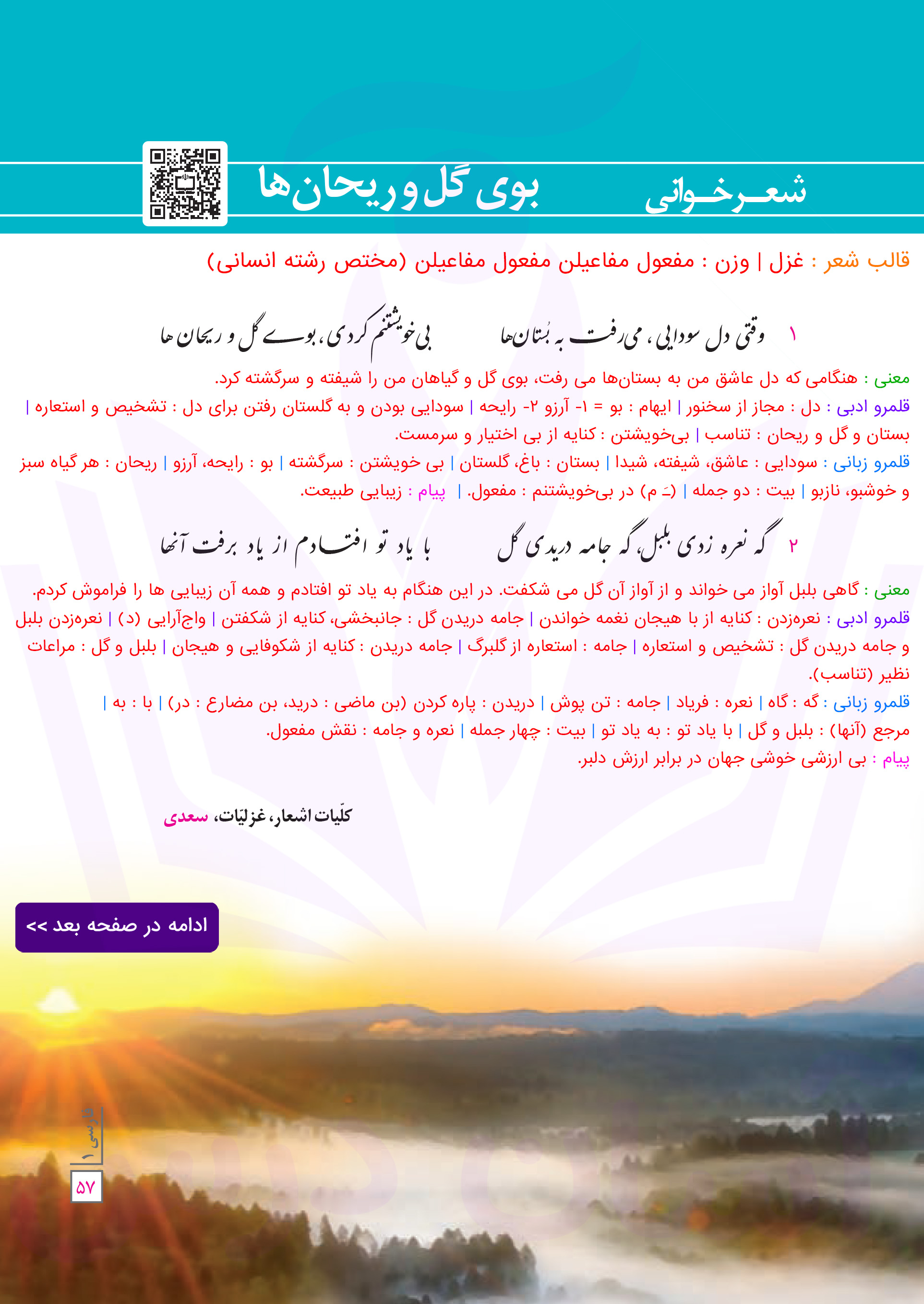 فارسی دهم : ادامه معنی شعرخوانی و پاسخ درک و دریافت صفحه ۵۷