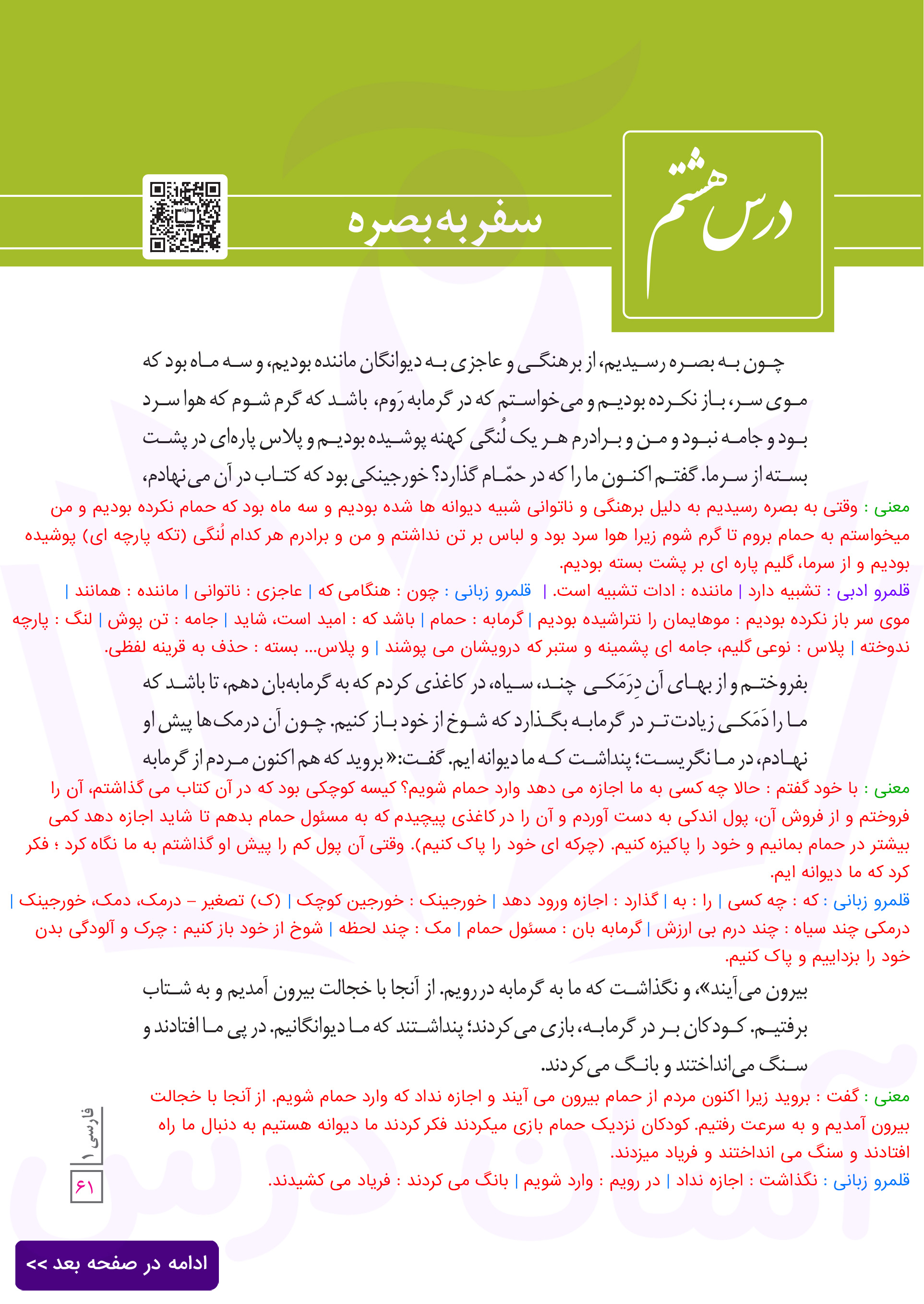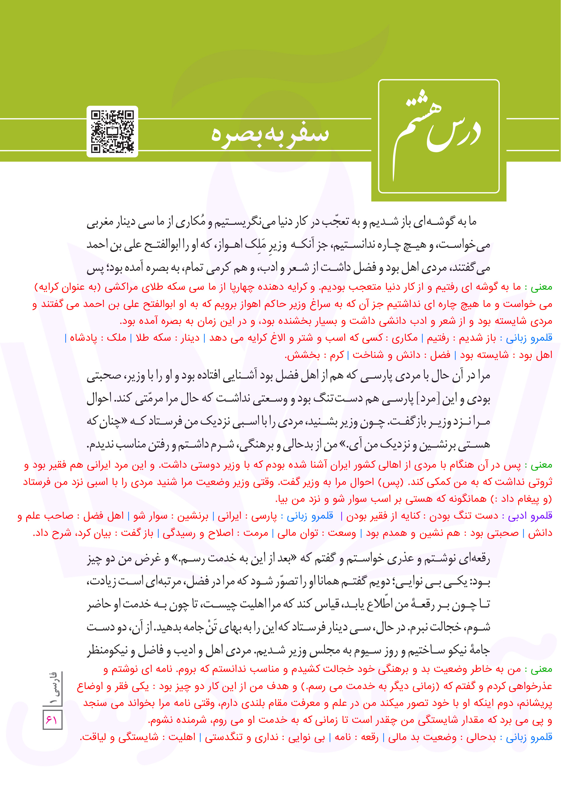 فارسی دهم : معنی درس هشتم (سفر به بصره) صفحه ۶۱