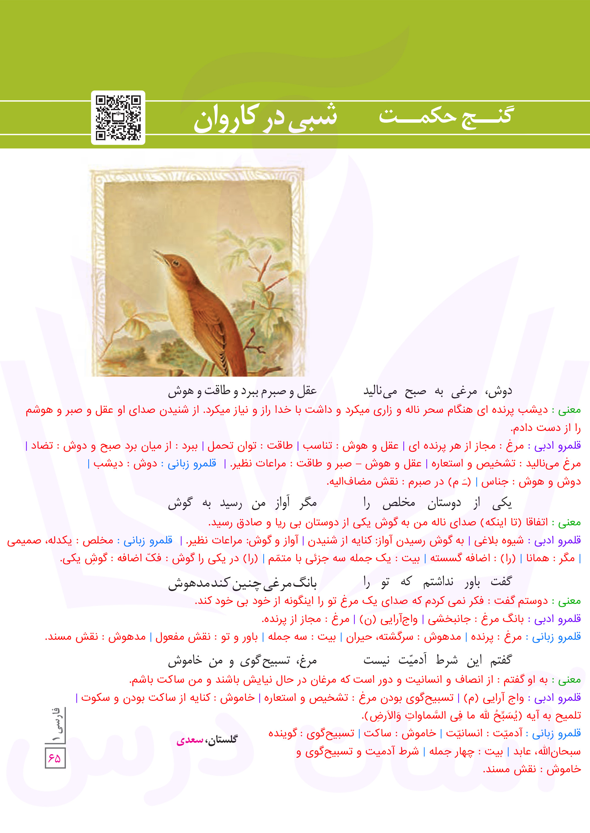 فارسی دهم : ادامه معنی گنج حکمت (شبی در کاروان) صفحه ۶۵