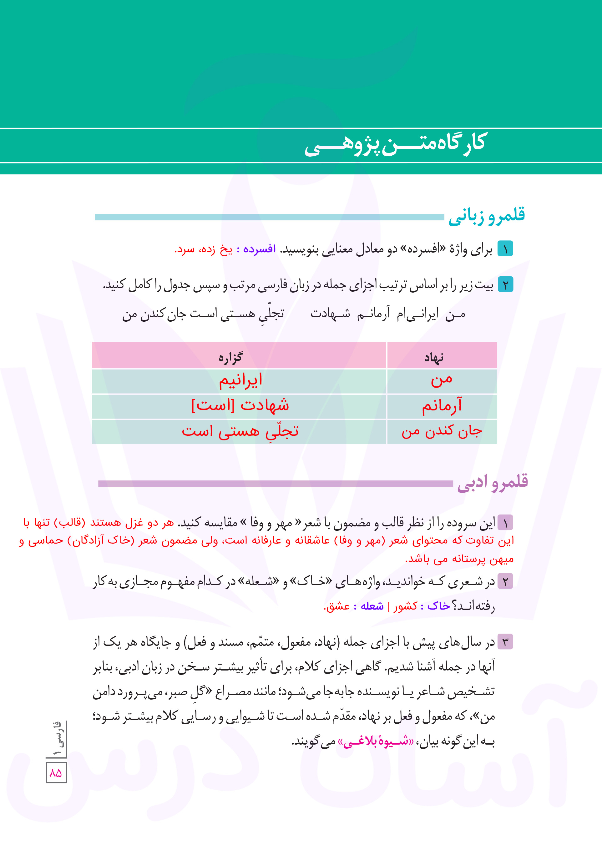 فارسی دهم : پاسخ قلمرو زبانی و قلمرو ادبی صفحه ۸۵