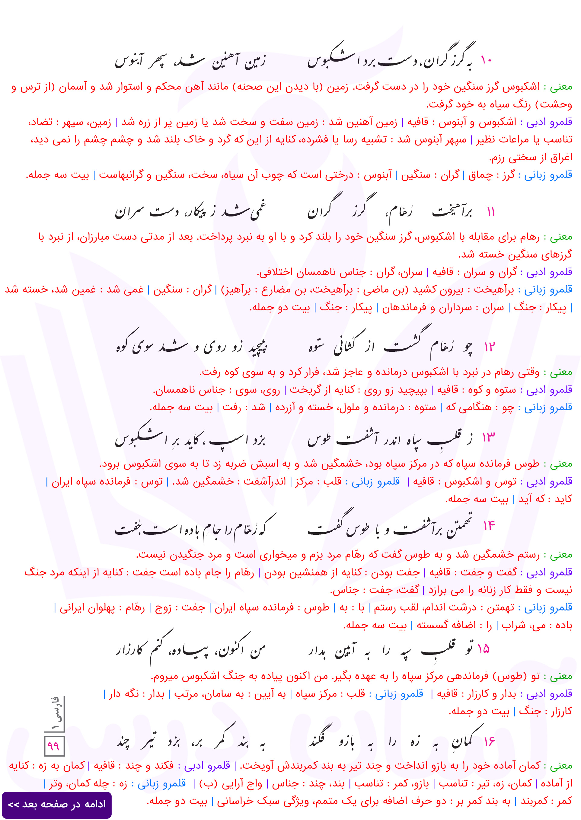 فارسی دهم : ادامه معنی درس دوازدهم (رستم و اشکبوس) صفحه ۹۹