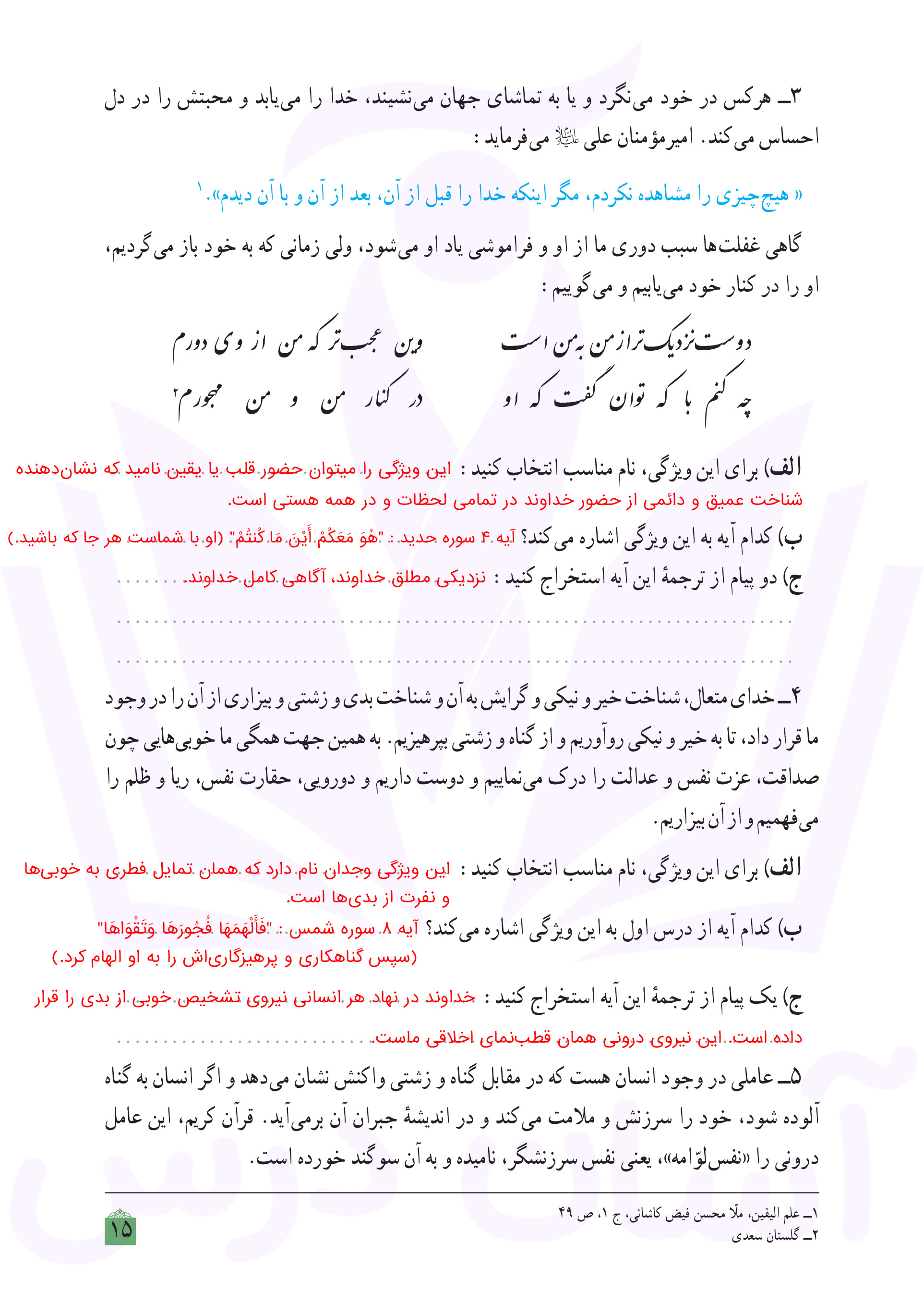 دینی دهم : پاسخ سوالات صفحه ۱۵