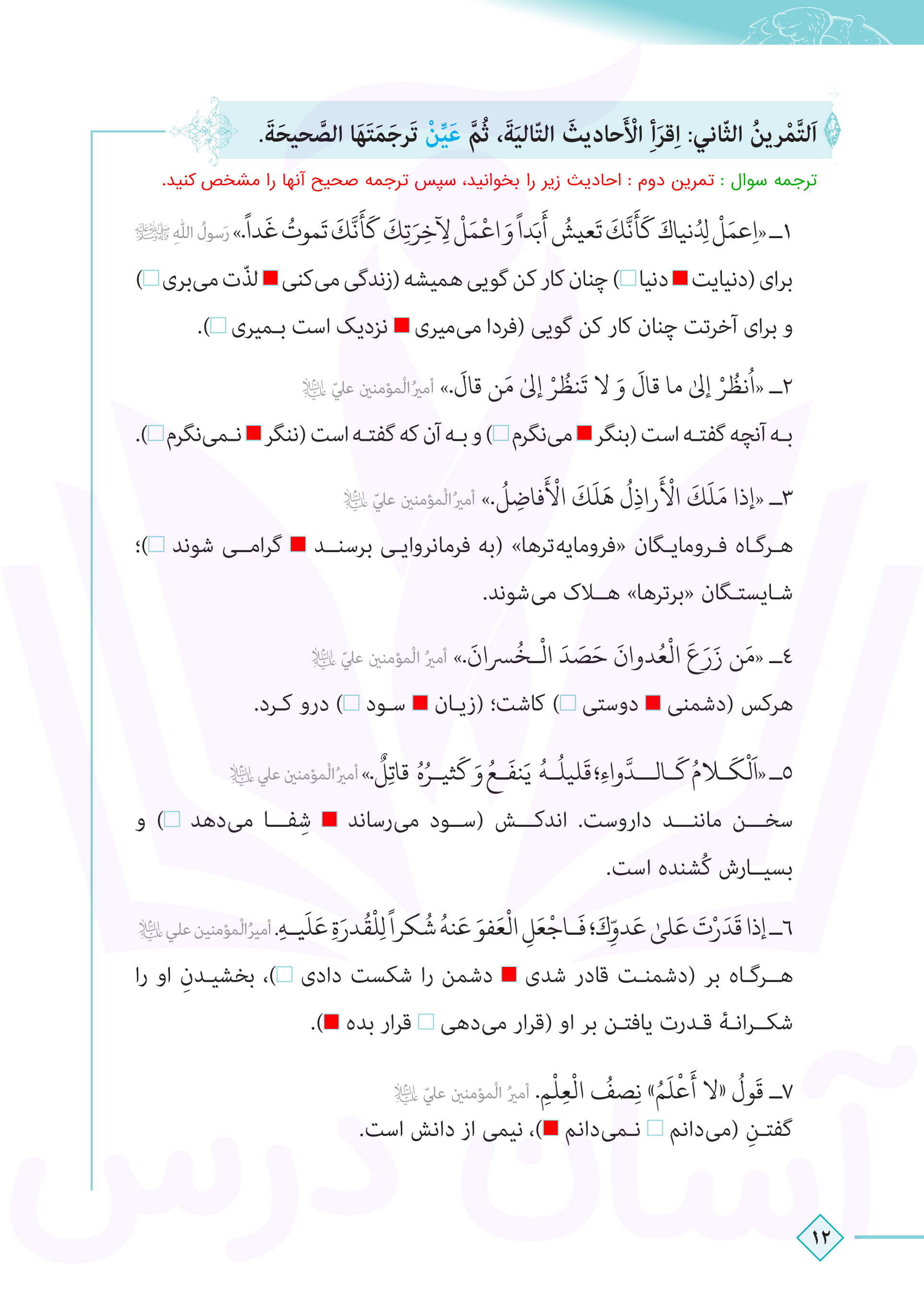 عربی دهم : پاسخ تمرینات صفحه ۱۲