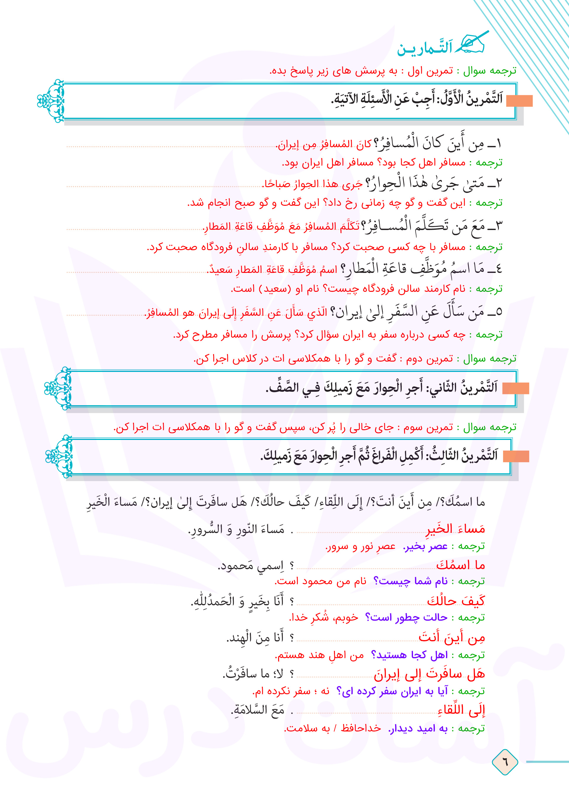 عربی دهم : پاسخ تمرینات صفحه ۶