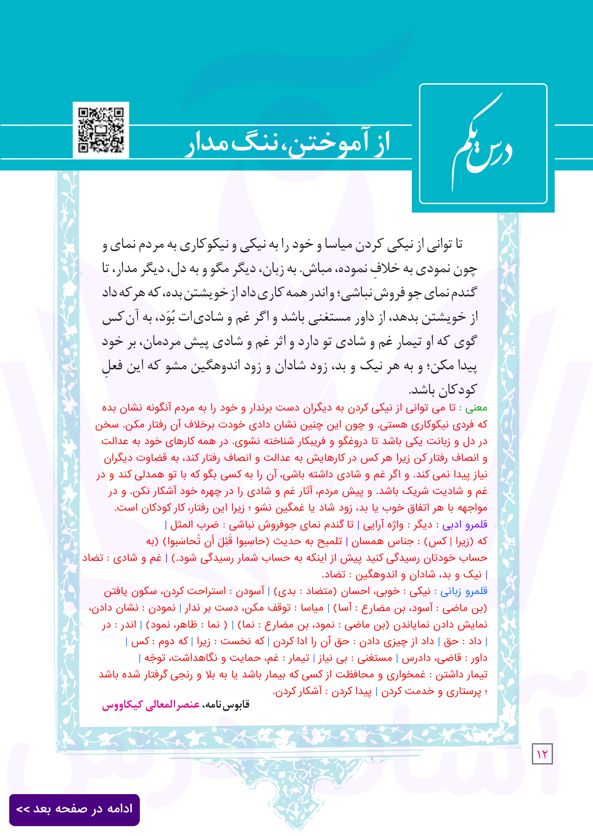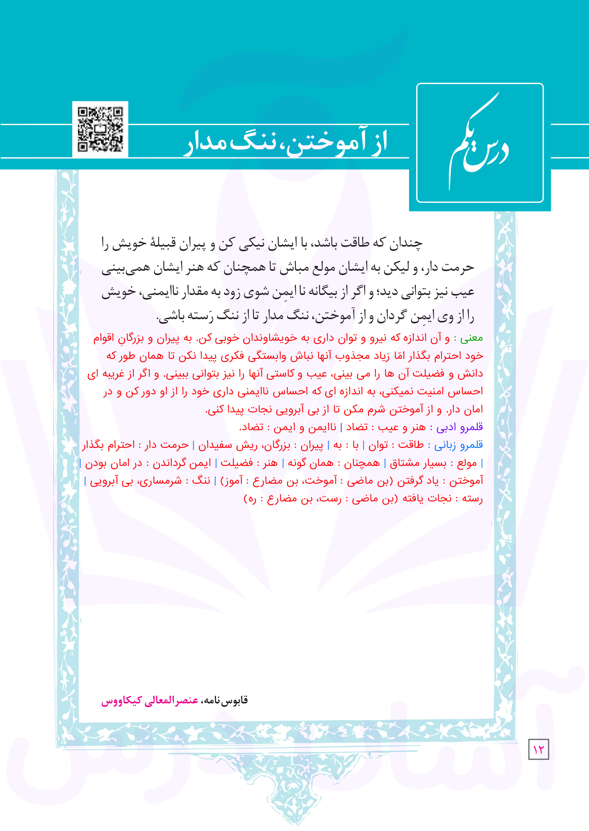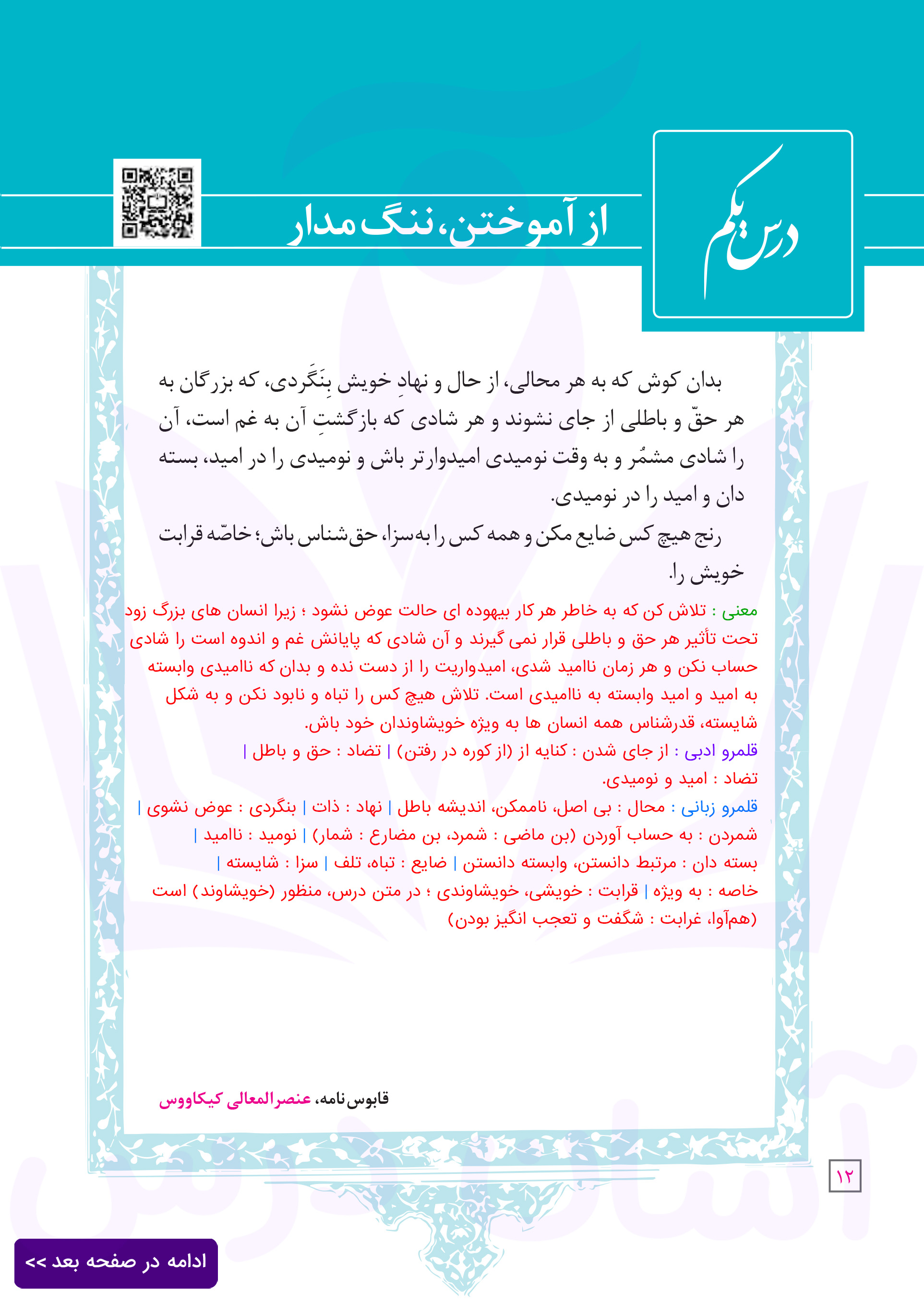 فارسی و نگارش دهم : معنی درس یکم (از آموختن) صفحه ۱۲