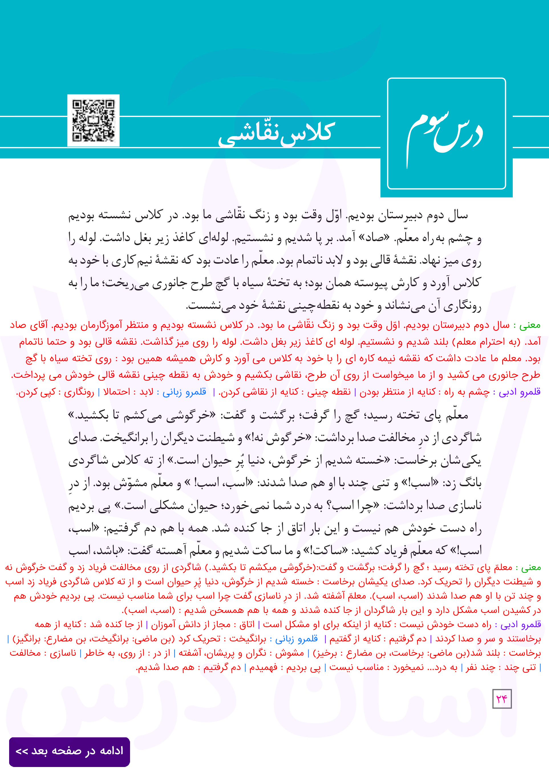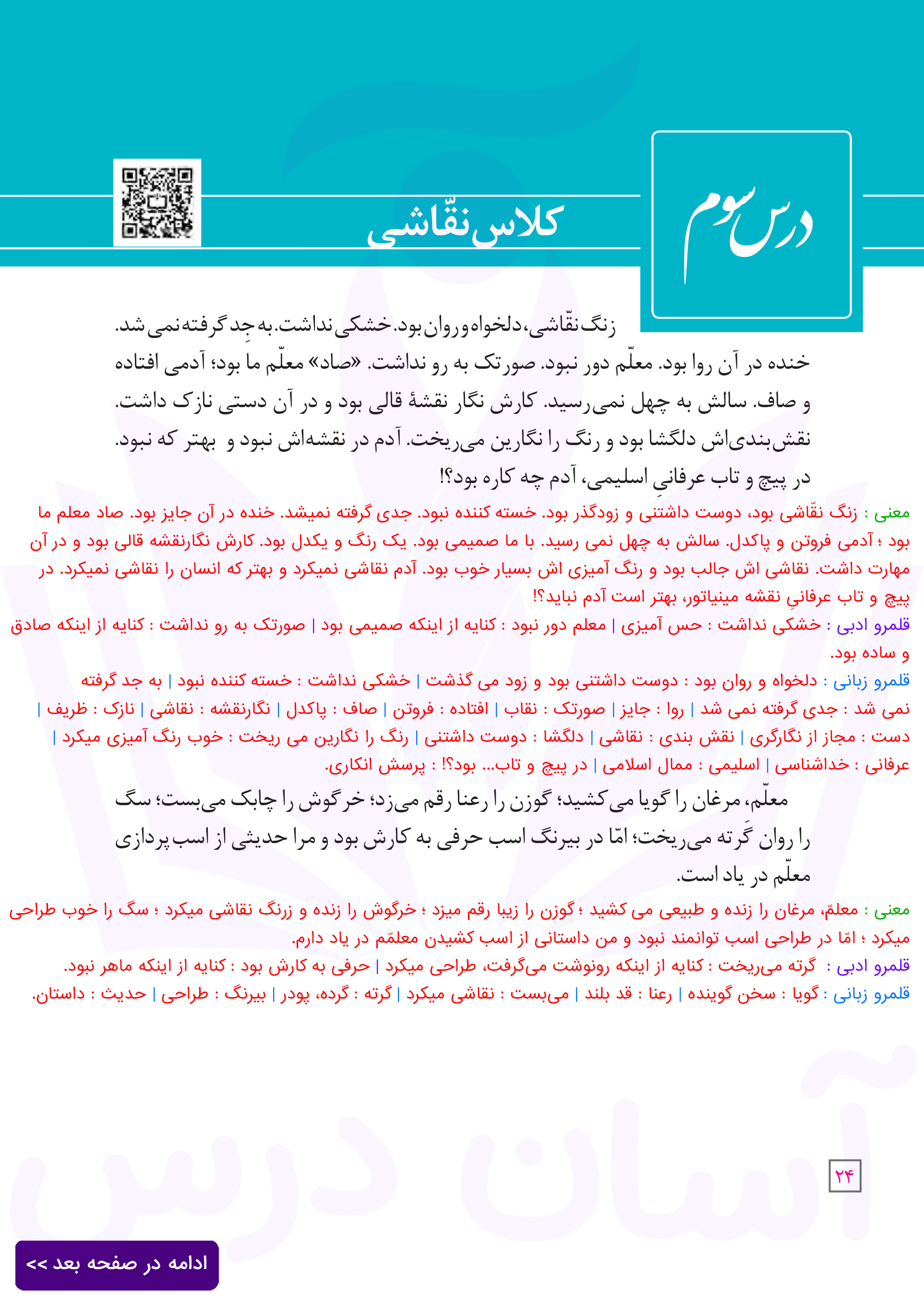 فارسی و نگارش دهم : ادامه معنی درس سوم (کلاس نقّاشی) صفحه ۲۴