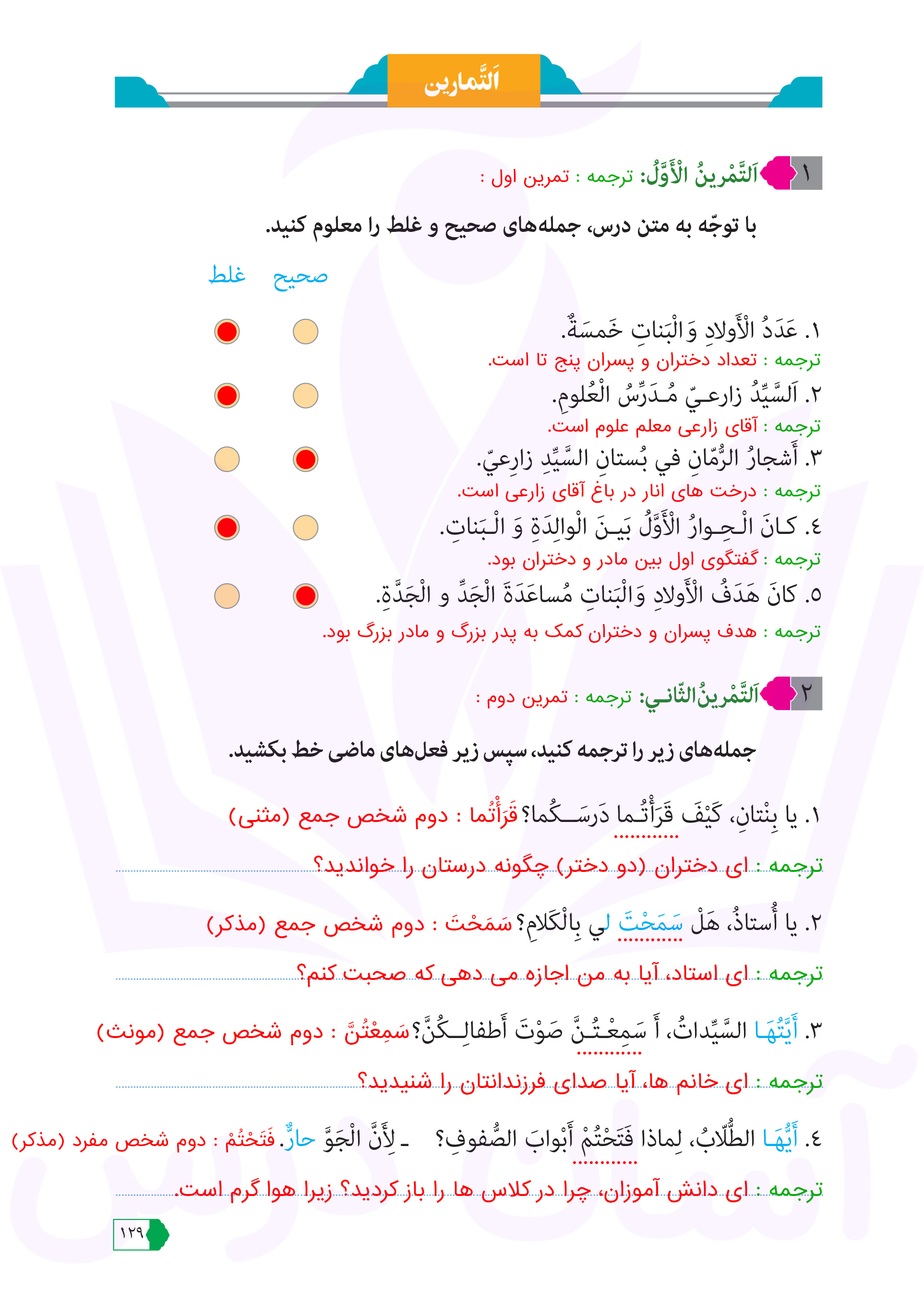عربی هفتم : پاسخ تمرینات صفحه ۱۲۹