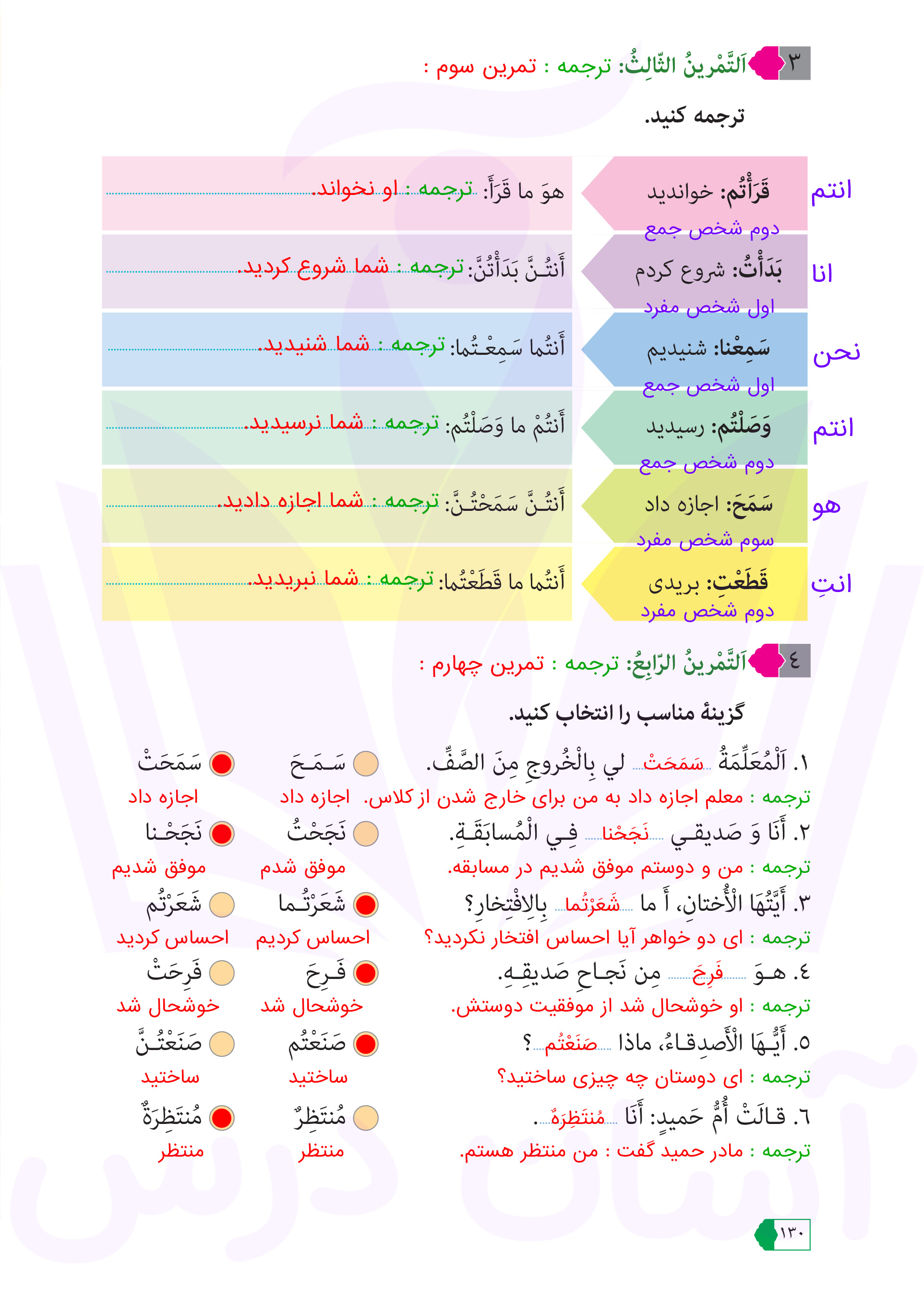 عربی هفتم : پاسخ تمرینات صفحه ۱۳۰