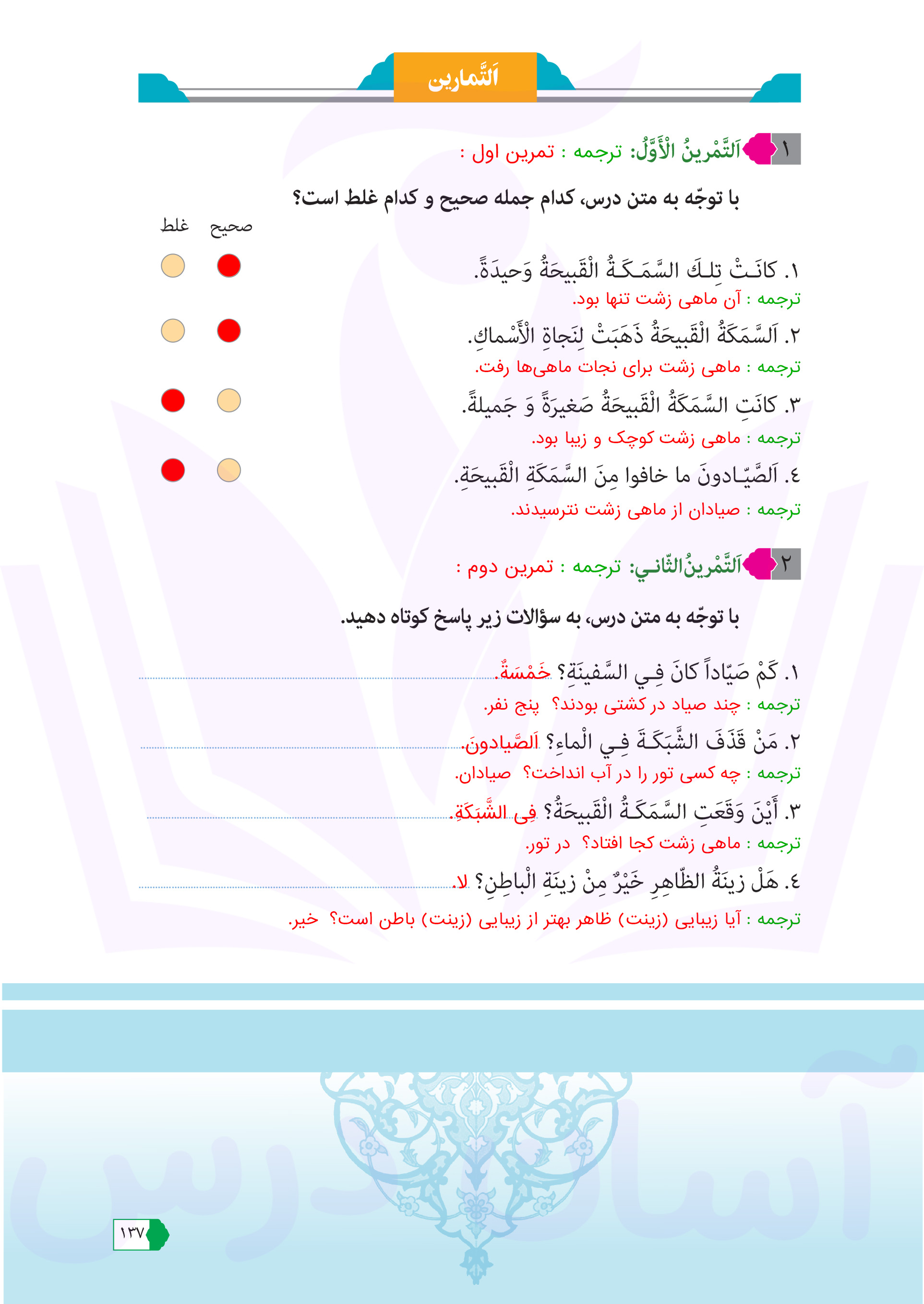 عربی هفتم : پاسخ تمرینات صفحه ۱۳۷