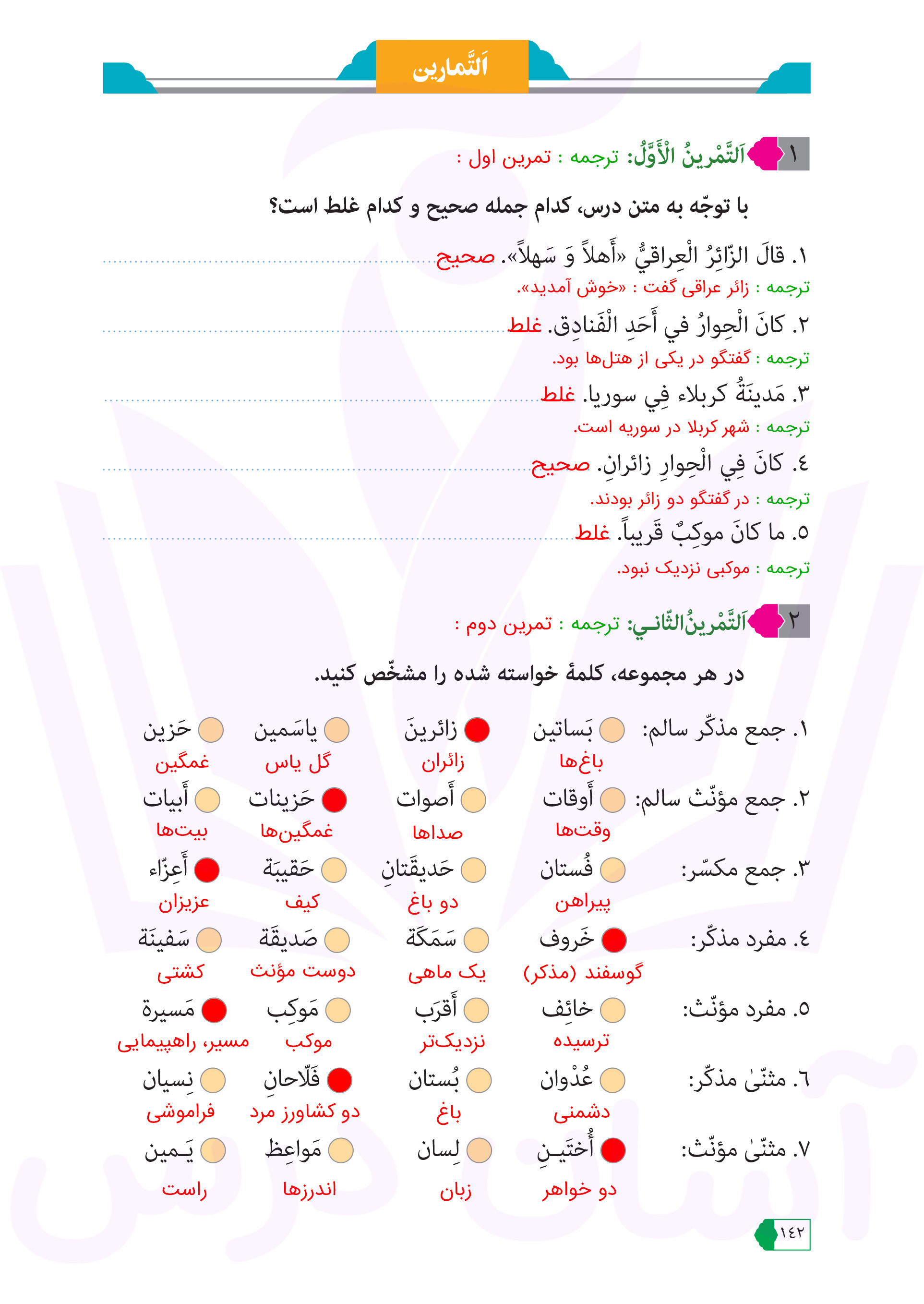 عربی هفتم : پاسخ تمرینات صفحه ۱۴۲