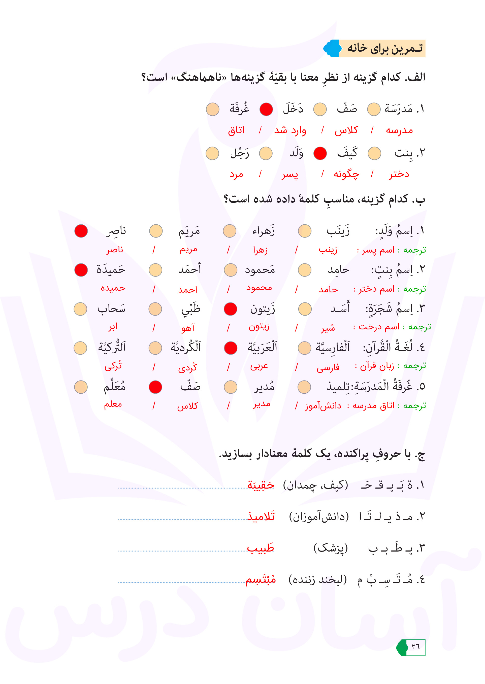 عربی هفتم : پاسخ تمرین برای خانه صفحه ۲۶