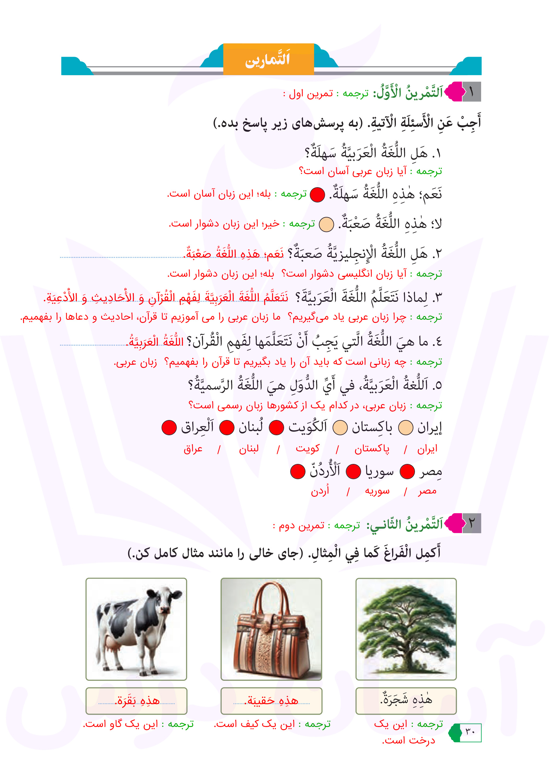 عربی هفتم : پاسخ تمرینات صفحه ۳۰
