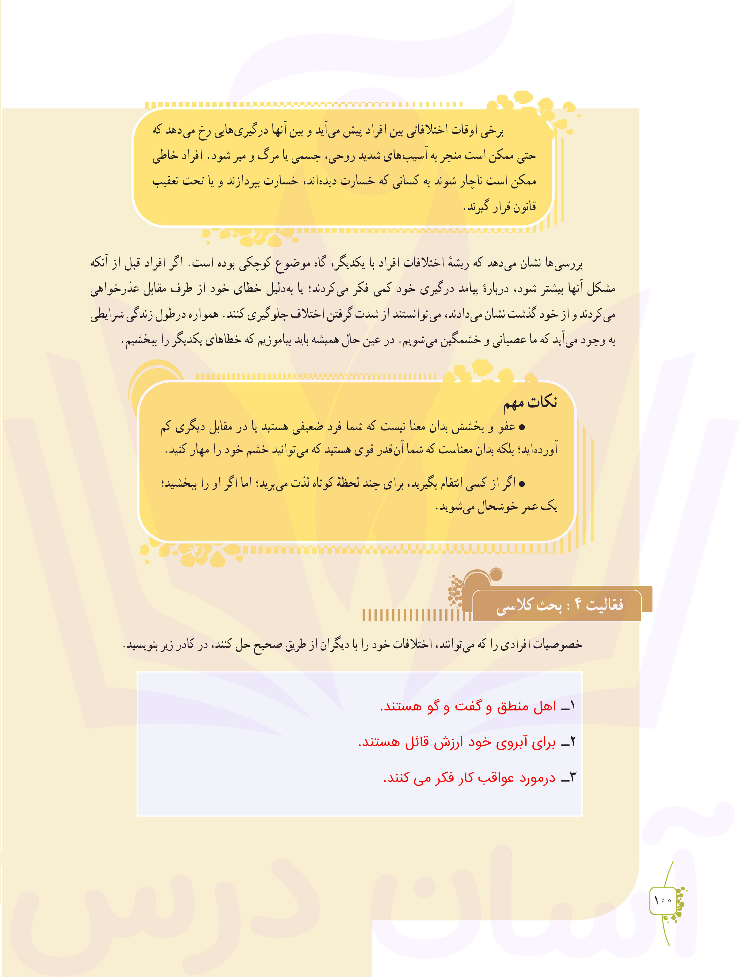 تفکر هفتم : پاسخ فعالیت صفحه ۱۰۰