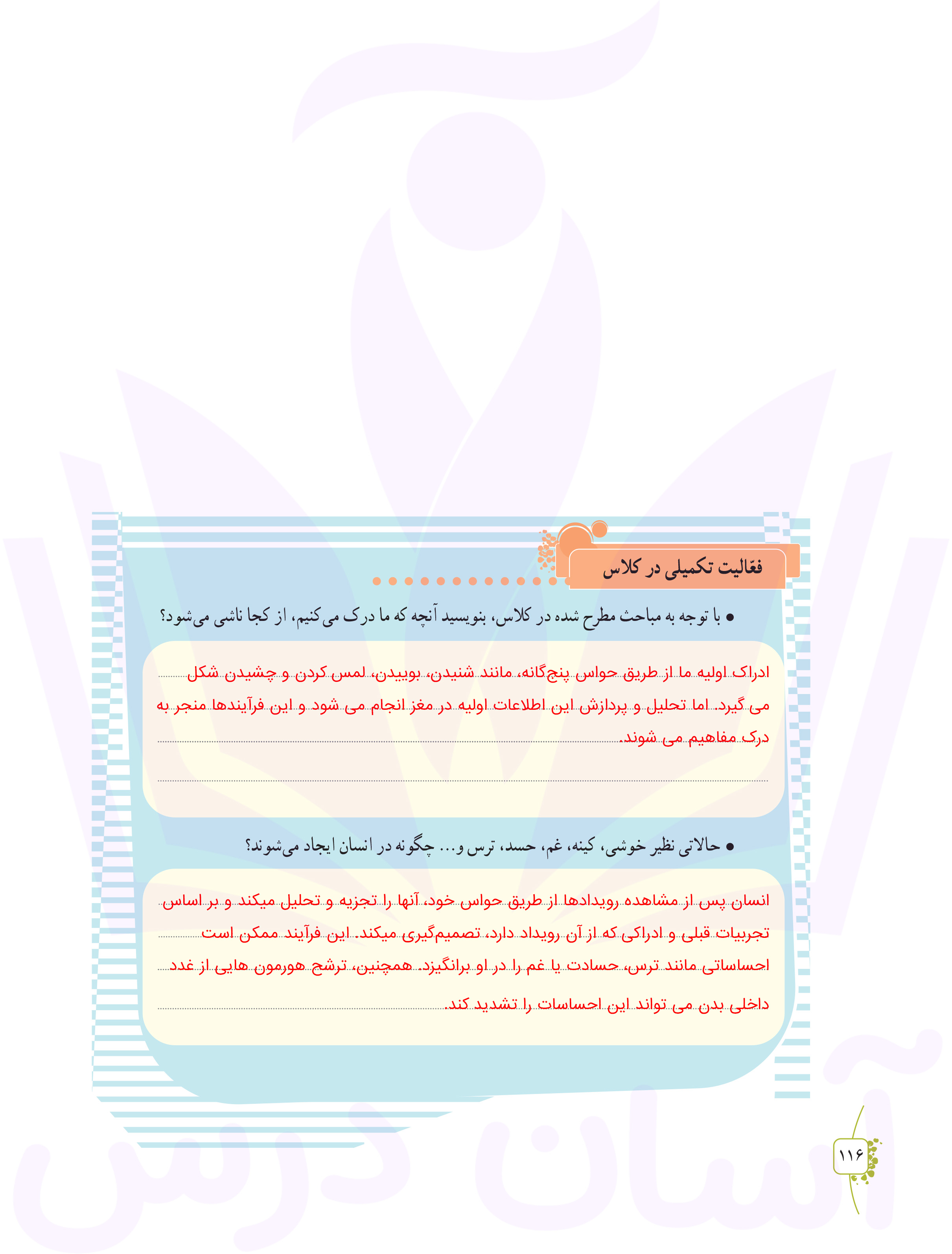 تفکر هفتم : ادامه پاسخ گفت و گو کنید و فعالیت تکمیلی صفحه ۱۱۶