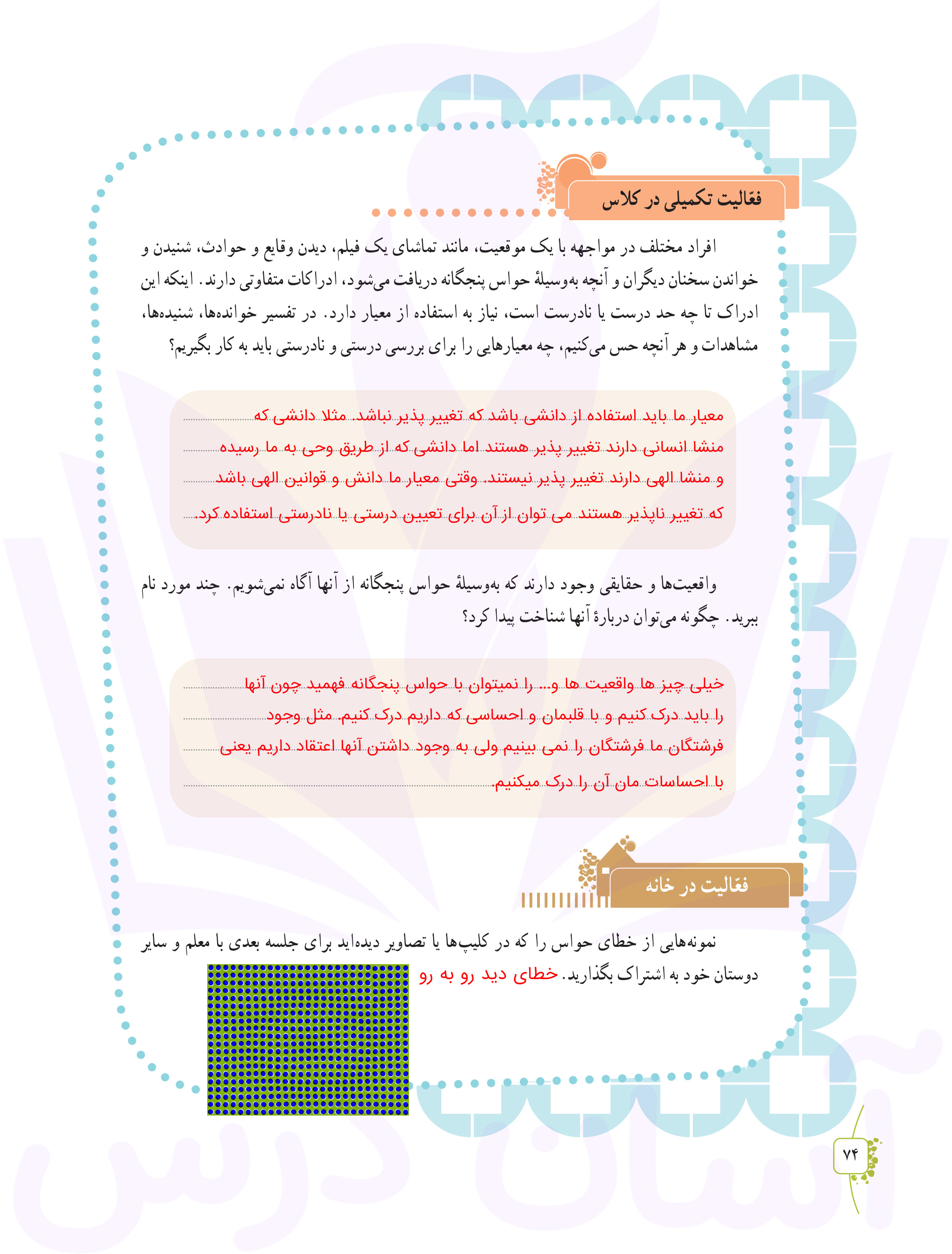 تفکر هفتم : پاسخ فعالیت تکمیلی و فعالیت در خانه صفحه ۷۴