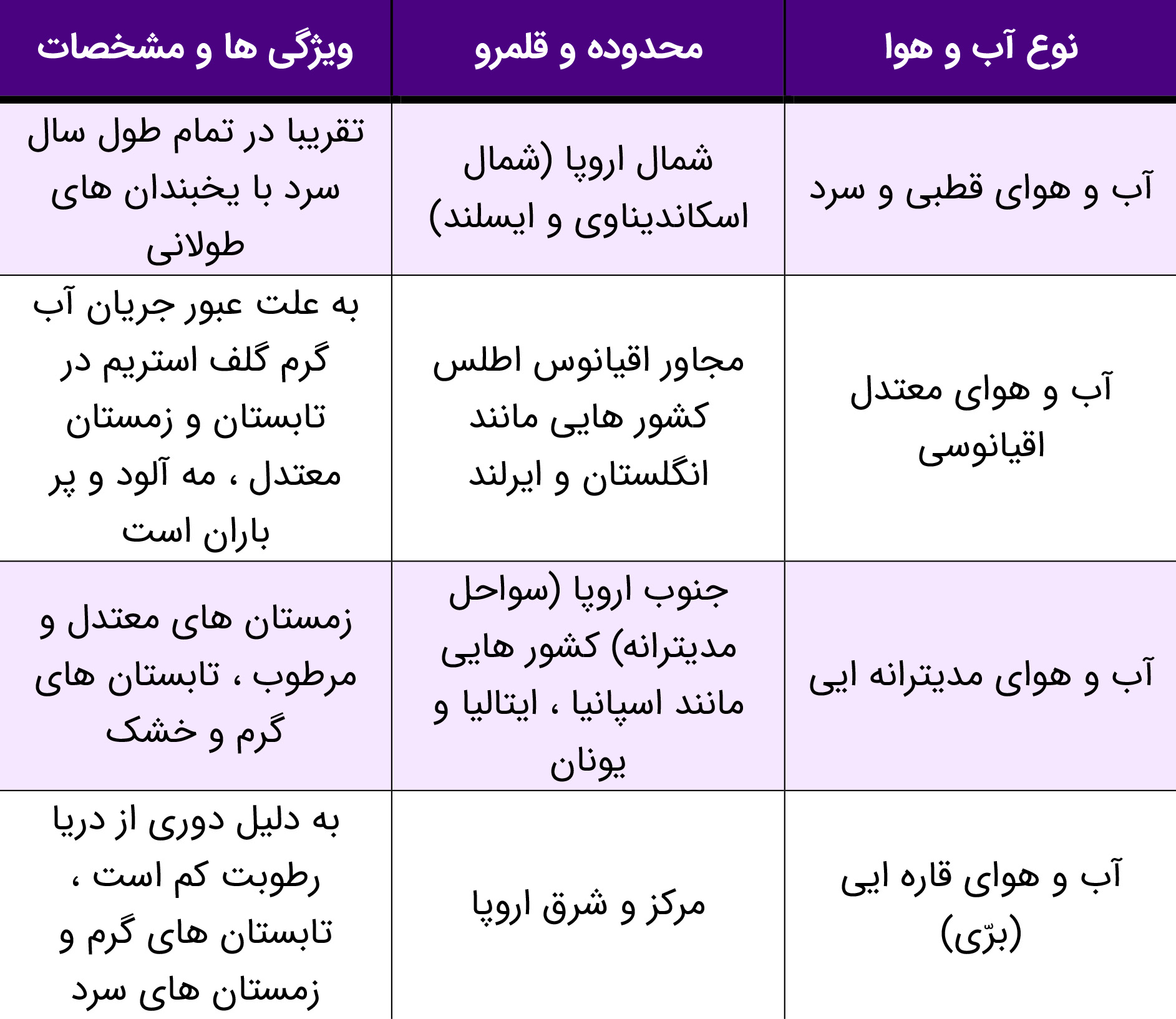 ۳۳. انواع آب و هوای اروپا را نام برده و منطقه تحت پوشش این آب و هوا را ذکر کنید.