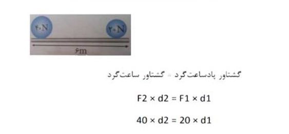 پاسخ : اگر در ۲ متری نیروی ۴۰ نیوتونی و ۴ متری نیروی ۲۰ نیوتونی قرار بگیرد تعادل برقرار می شود. (توجه : مجموع بازو ها ۶ متر است. پس باید مجموع طول ها ۶ متر باشد) بنابراین : d1 = 4m و d2 = 2m