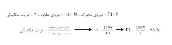 ۱۶. اگر مزیت مکانیکی اهرم ۲ و اندازه وزنه نیروی مقاوم ۱۵۰ نیوتون باشد اندازه نیروی محرک چقدر باشد تا دستگاه در حالت تعادل باقی بماند؟