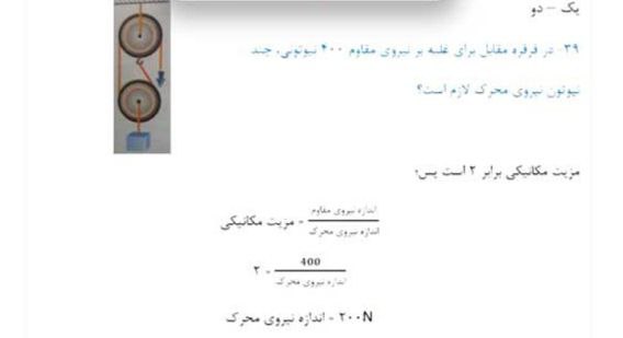 ۴. در قرقره مقابل برای غلبه بر نیروی مقاوم ۴۰۰ نیوتونی چند نیوتون نیروی محرک لازم است؟