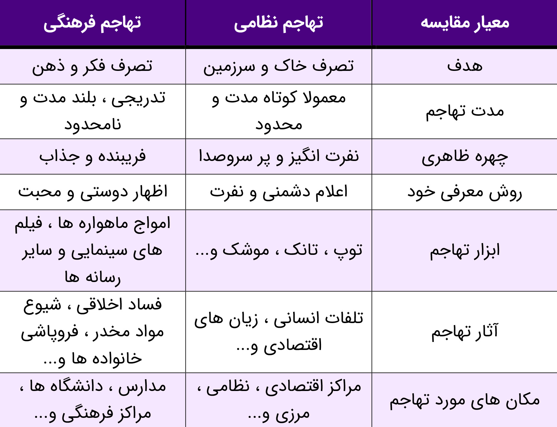 ۸. تهاجم نظامی را با تهاجم فرهنگی از لحاظ معیارهای مطرح شده مقایسه کنید.